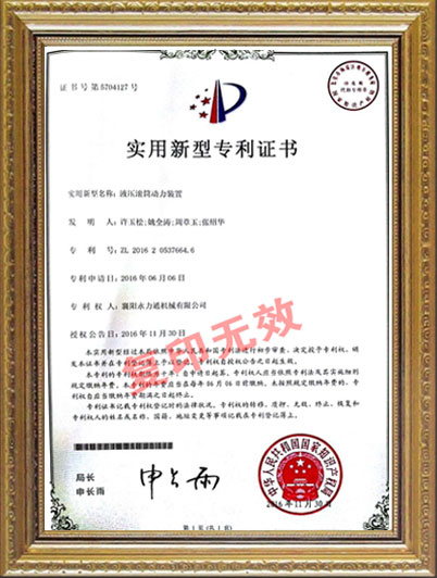 • 液壓滾筒動(dòng)力裝置新型專利證書