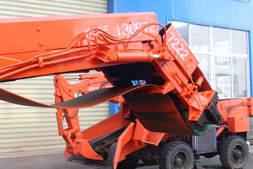 5、本機(jī)采用電動(dòng)全液壓傳動(dòng),液壓行走、挖掘采集、輸送、裝車四種功能,機(jī)構(gòu)緊湊,推進(jìn)力大,扒取范圍廣,可以全斷面裝巖,不留死角,不需人工輔助清理工作面