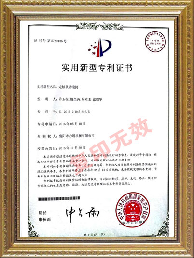 • 定軸從動(dòng)滾筒實(shí)用新型專利證書